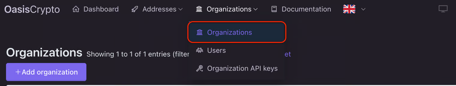* A continuación, debe crear claves API para la organización que creó anteriormente; esto debe hacerse en la sección "Claves API de la organización"