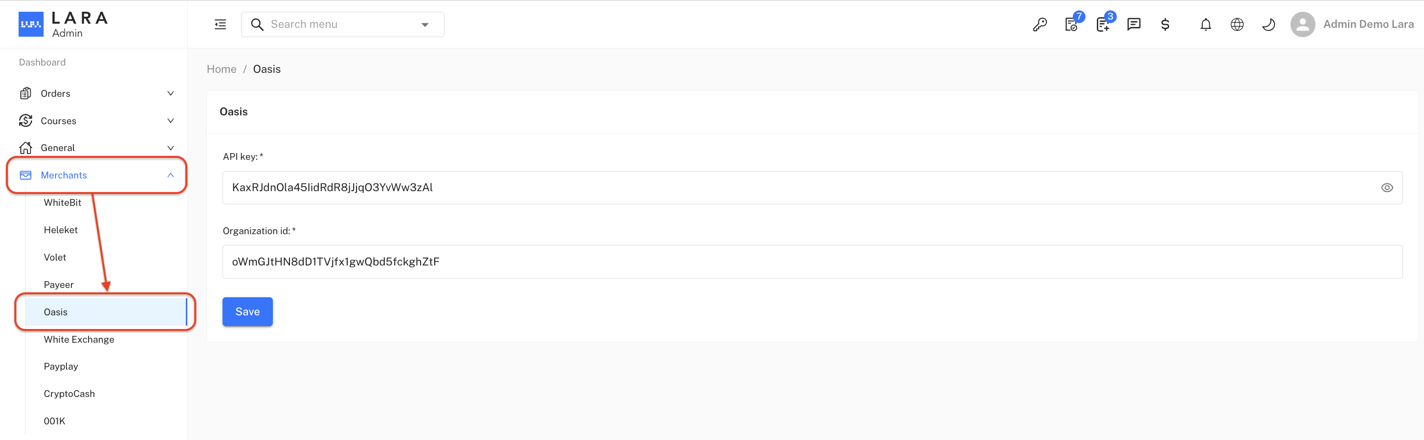 **Instrucciones para agregar el comerciante Oasis en el panel de administración de Lara Script**