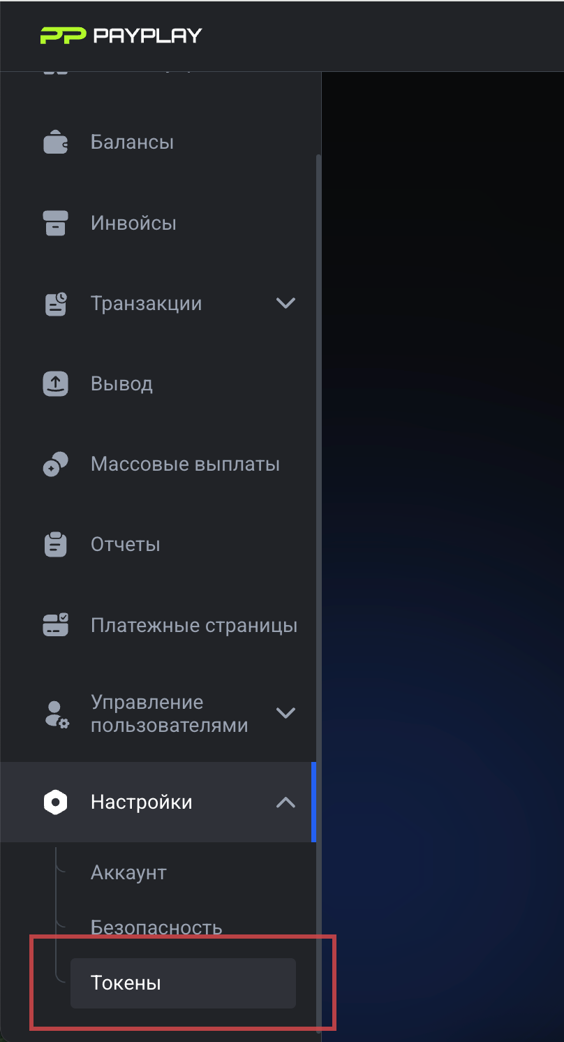 1. En el panel de PayPlay vaya a **Ajustes → Tokens**.<br>