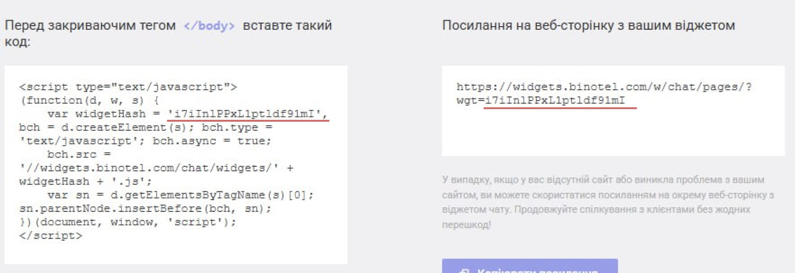Del código recibido debe pegar en el campo hash de Binotel en el panel de administración solo el código después de "WidgetHash"