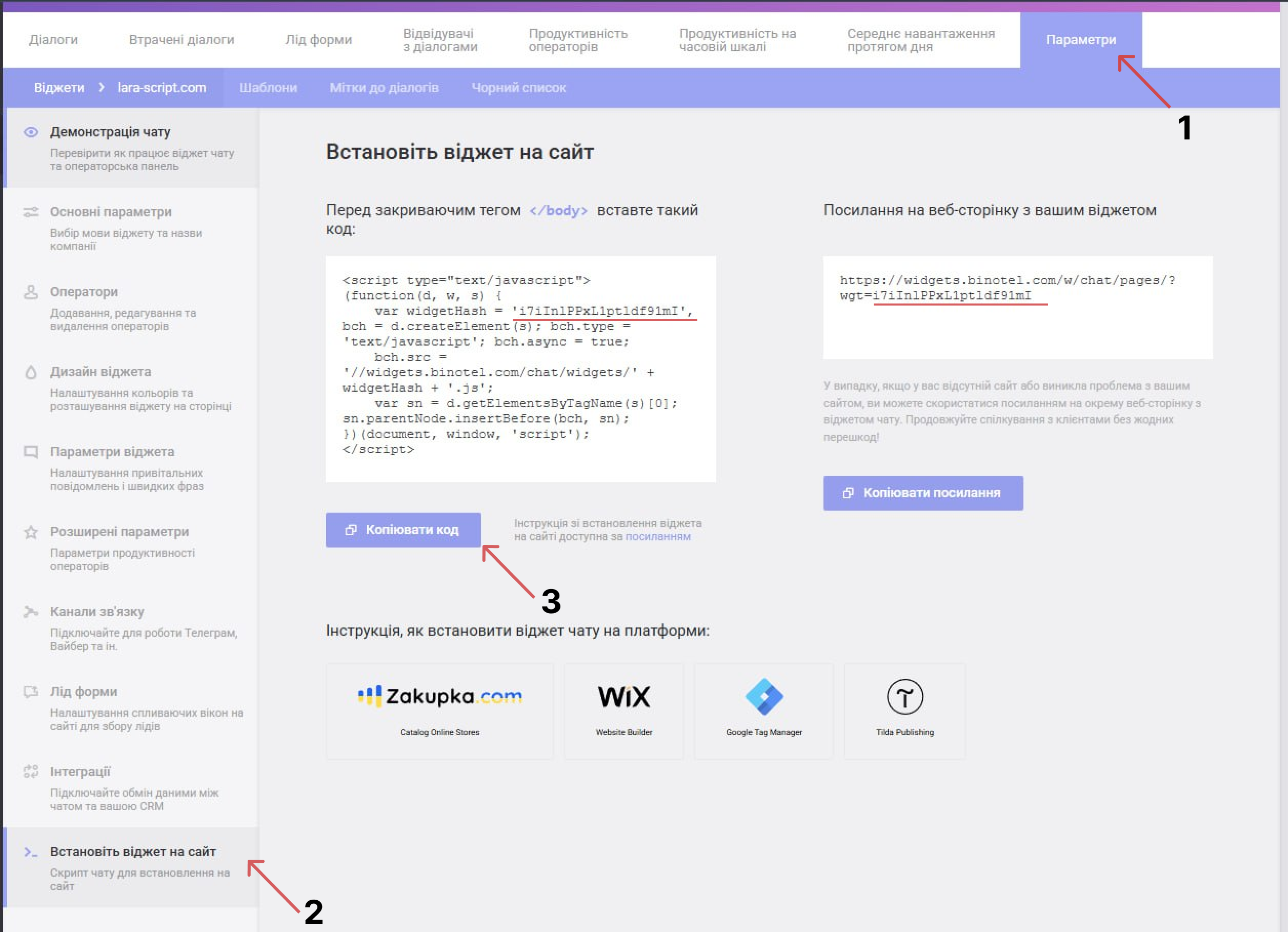 En el propio panel de administración vaya a la sección "Parámetros" en la parte superior del panel, seleccione su widget y luego vaya a la sección "Instalar widget en el sitio" donde podrá encontrar el código que necesita<br>