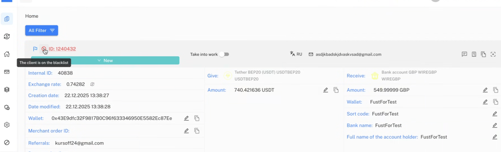 En el panel de administración de sitios basados en **Lara-script** se implementa la funcionalidad **de una lista negra (Blacklist)**, que permite bloquear clientes problemáticos y, si es necesario, **compartir información sobre ellos con otros cambiadores** a través de la integración con el agregador **Kursoff**. La funcionalidad de la lista negra permite bloquear globalmente a un usuario del sitio. Tras ser bloqueado, el cliente ya no podrá crear nuevas solicitudes y cualquier colaboración posterior con él se dará por terminada.